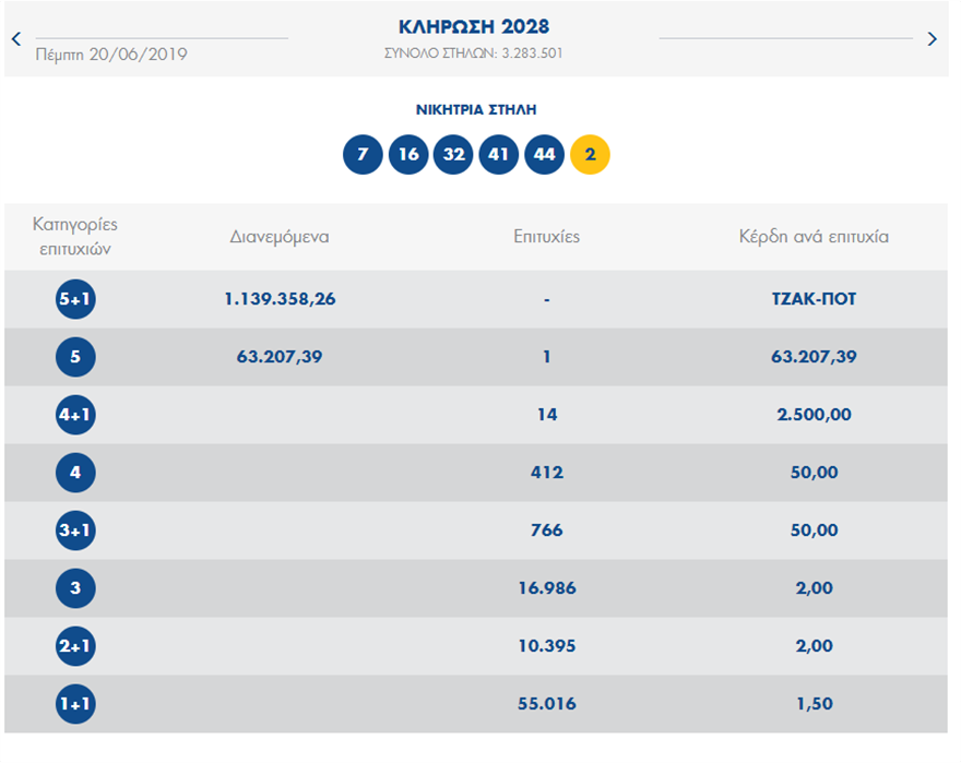 Οι αριθμοί που κληρώθηκαν είναι: 7, 16, 32, 41, 44 και τζόκερ ο αριθμός 2