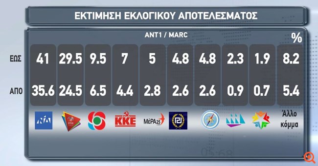 Προβάδισμα 10,5 μονάδων της ΝΔ έναντι του ΣΥΡΙΖΑ «βλέπει» η νέα δημοσκόπηση της Marc για λογαριασμό του ΑΝΤ1 εν όψει των εθνικών εκλογών της 7ης Ιουλίου.