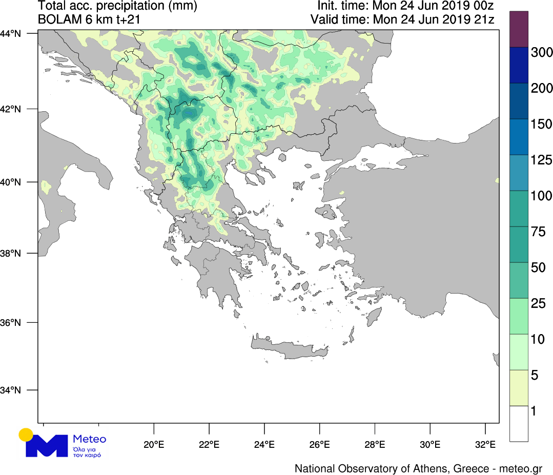 Η γεωγραφική κατανομή του ολικού αναμενόμενου ύψος υετού (βροχή/χαλάζι) έως το βράδυ της Δευτέρας 24/06, φαίνεται στο χάρτη που ακολουθεί.