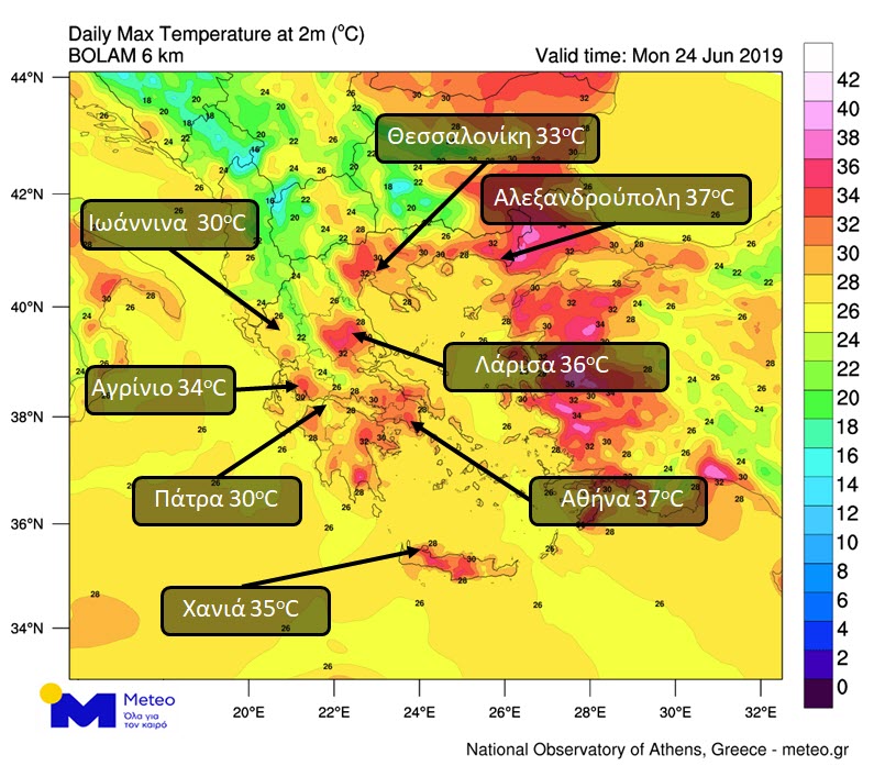 Στο χάρτη που ακολουθεί παρουσιάζεται η κατανομή των αναμενόμενων μέγιστων θερμοκρασιών, καθώς και η αναμενόμενη μέγιστη θερμοκρασία για 8 πόλεις της χώρας.