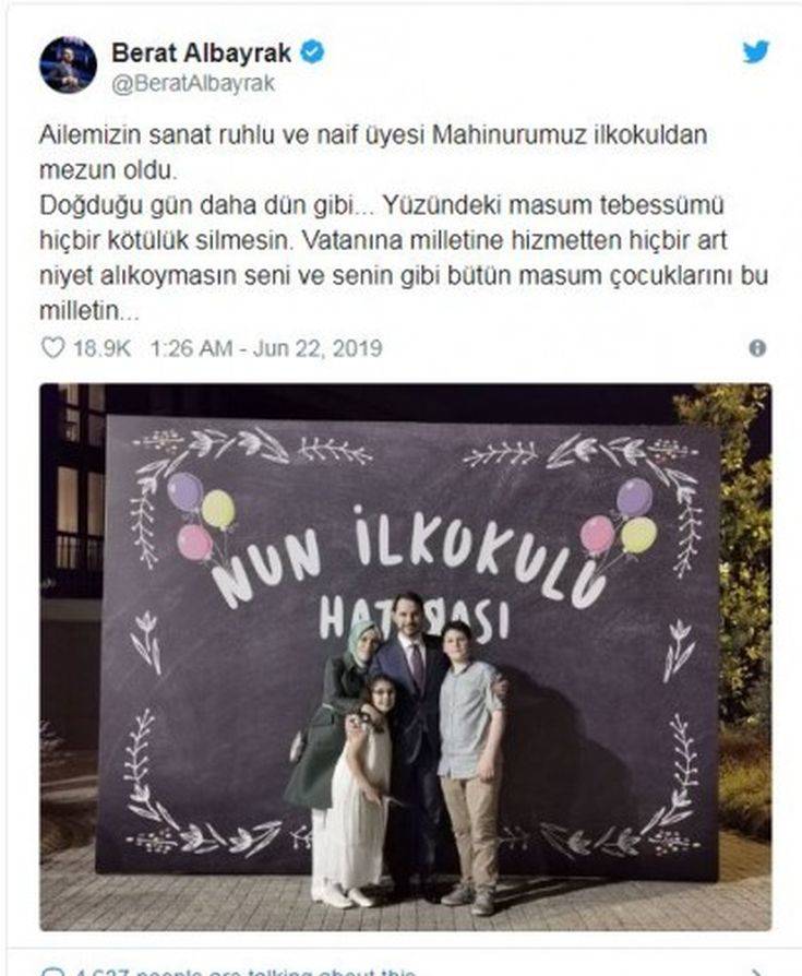 Προφανώς η απόφασή του να αναρτήσει το περασμένο Σάββατο φωτογραφία του με την οικογένειά του στα social media δεν στάθηκε ικανή να κατευνάσει τα πνεύματα. Η φωτογραφία που, μάλιστα, κοινοποίησε και το τουρκικό κρατικό πρακτορείο ειδήσεων Ανατολή, έδειχνε τον Αλμπαϊράκ με τη σύζυγό του, τον γιο και την κόρη τους. Σύμφωνα με το τουρκικό σάιτ tr724, είχε τραβηχτεί μία εβδομάδα νωρίτερα, κατά τη διάρκεια της τελετής αποφοίτησης της κόρης στους από το σχολείο.