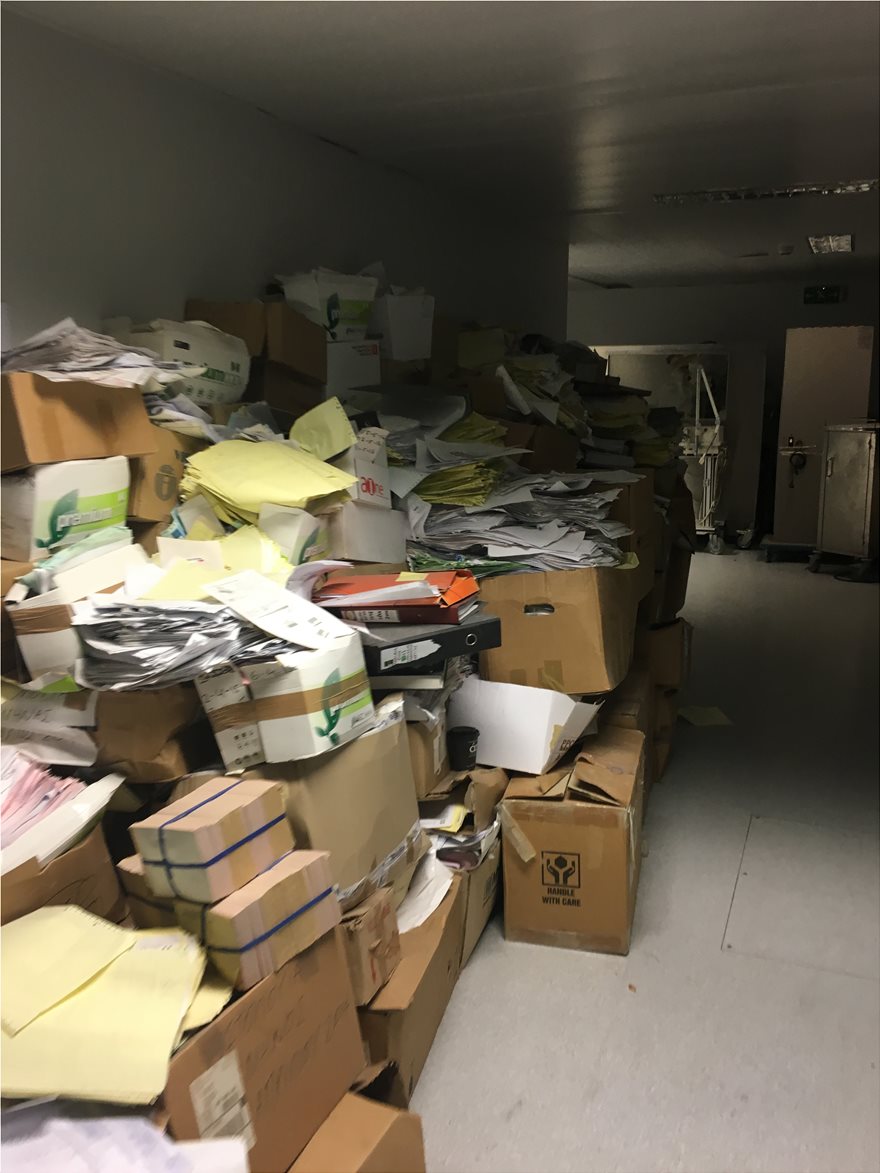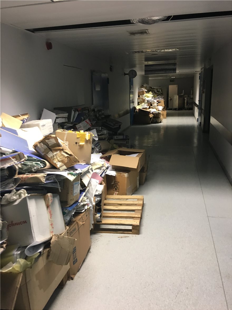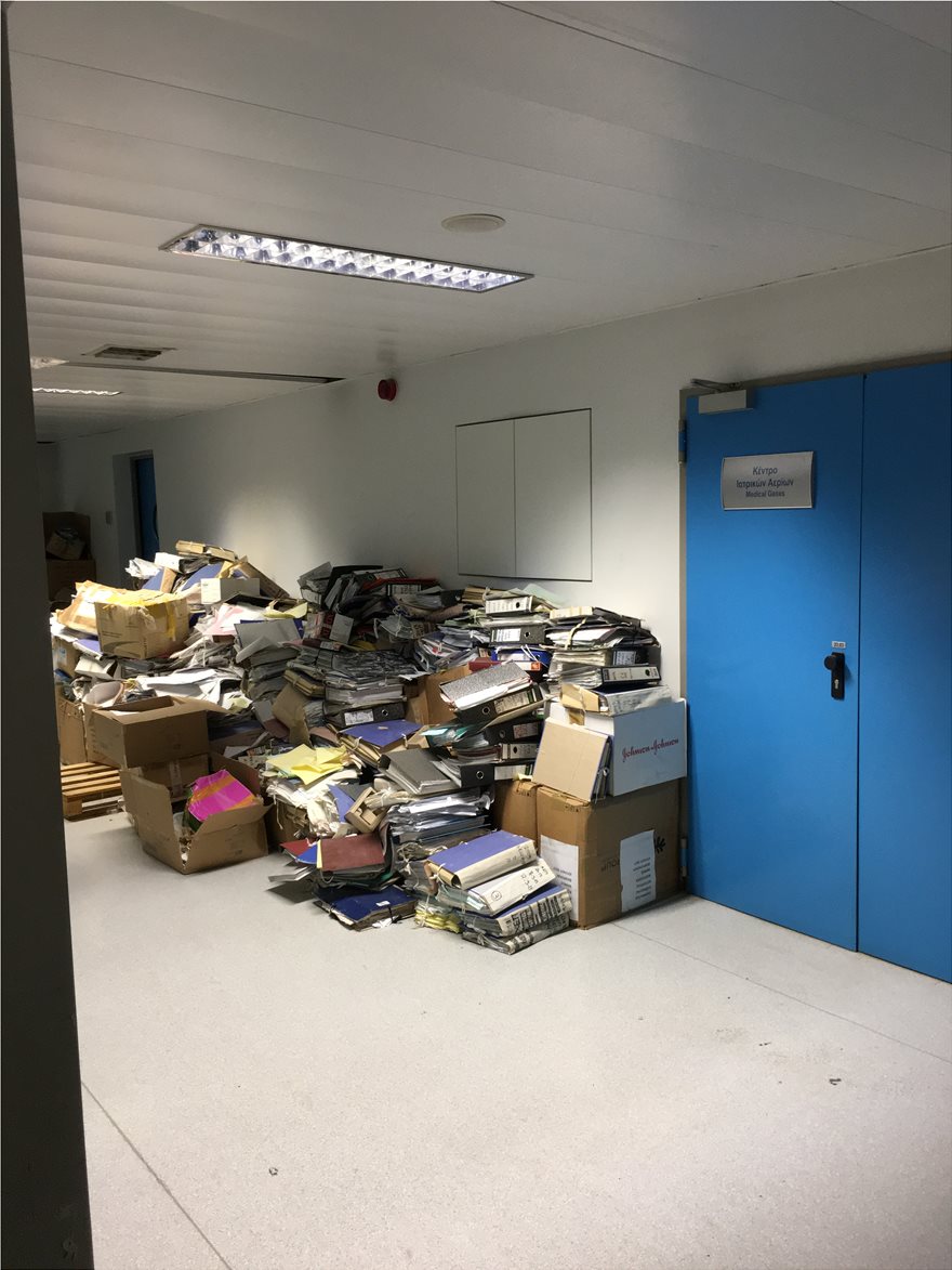 Όπως μαρτυρούν οι φωτογραφίες, στην καλύτερη περίπτωση οι ιατρικοί φάκελοι βρίσκονται μέσα σε κούτες (σημειωτέον είναι κούτες από ιατρικό υλικό και αναλώσιμα), στη χειρότερη βρίσκονται αφημένοι δίπλα σε παλέτες και φορεία. Σε αυτές τις κούτες «φυλλάσσονται» ιατρικά δεδομένα ασθενών που είχαν νοσηλευτεί στο νοσοκομείο πριν από τέσσερα με πέντε έτη.