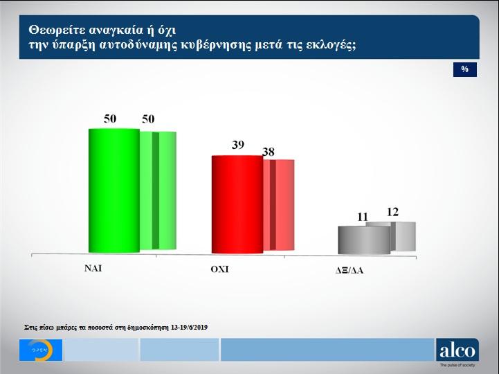 Σε σχέση με την ανάγκη αυτοδυναμίας της νέας κυβέρνησης μετά τις εκλογές, το 50% απάντησε ότι είναι αναγκαία, ενώ το 39% είπε ότι δεν είναι.