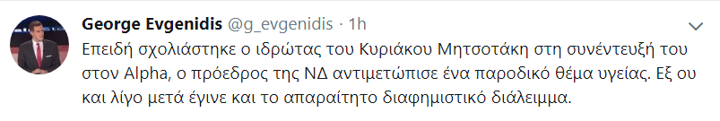 Τελικά, την εξήγηση την έδωσε ο δημοσιογράφος Γιώργος Ευγενίδης, ο οποίος έγραψε στο Twitter: «Επειδή σχολιάστηκε ο ιδρώτας του Κυριάκου Μητσοτάκη στη συνέντευξή του στον Alpha, ο πρόεδρος της ΝΔ αντιμετώπισε ένα παροδικό θέμα υγείας. Εξ ου και λίγο μετά έγινε και το απαραίτητο διαφημιστικό διάλειμμα».