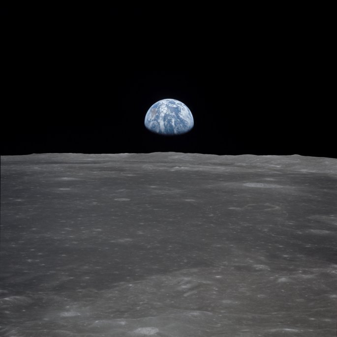 Στον ορίζοντα διακρίνεται η Γη. Ο Κόλινς παρέμεινε στο Columbia μέχρι να ολοκληρώσουν την πρώτη ιστορική επίσκεψη στην Σελήνη οι δύο συνάδελφοι του.