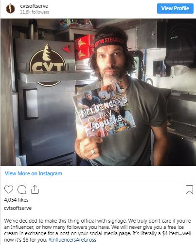 Έτσι, κρέμασε στο φορτηγό-παγωτατζίδικό του μια πινακίδα με ένα σύντομο και ξεκάθαρο μήνυμα: «Οι influencers πληρώνουν τα διπλά».