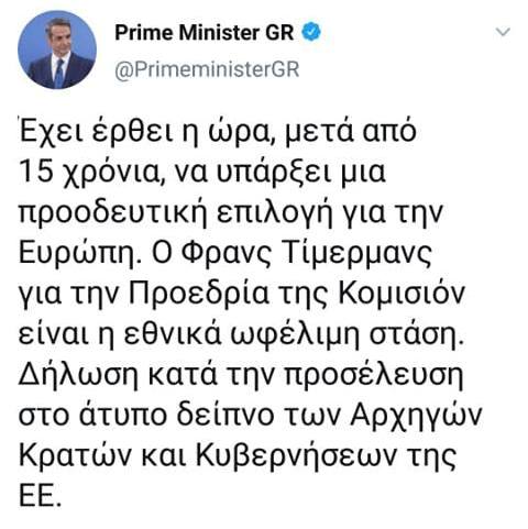 Καθώς με την ανάληψη της πρωθυπουργίας από τον Κυριάκο Μητσοτάκη ο λογαριασμός φέρει πλέον την φωτογραφία του, χωρίς ωστόσο -όπως είναι λογικό- να έχει αλλάξει κάτι στα tweets της περιόδου Τσίπρα, ο νέος πρωθυπουργός εμφανίζεται να… υποστηρίζει την Συμφωνία των Πρεσπών αλλά και να… αποχαιρετά τον Φιντέλ Κάστρο!