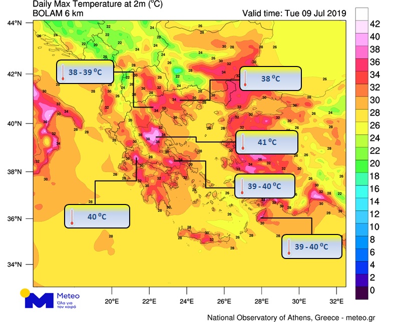 β. Αύριο Τετάρτη η θερμοκρασία, στα βόρεια θα πέσει κατά 3 με 4 βαθμούς, αλλά στα κεντρικά και τα νότια ηπειρωτικά θα φτάσει έως τους 40 με 42 βαθμούς.