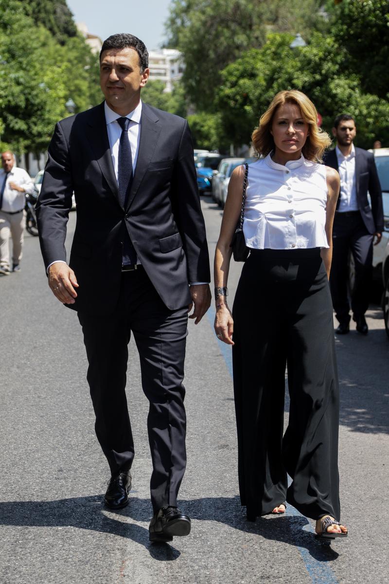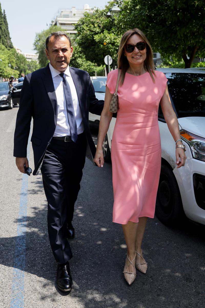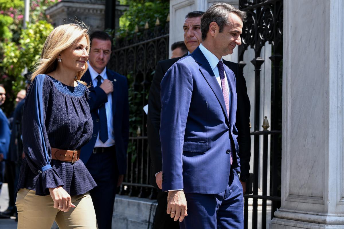 Ο πρωθυπουργός Κυριάκος Μητσοτάκης, συνοδευόμενος από την σύζυγό του Μαρέβα Γκραμπόβσκι, έφθασαν ακριβώς στις 12, για τη ορκωμοσία τη κυβέρνησης.