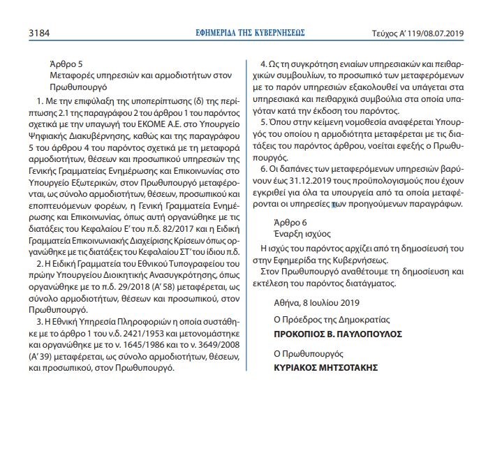 «Με την επιφύλαξη της υποπερίπτωσης (δ) της περίπτωσης 2.1 της παραγράφου 2 του άρθρου 1 του παρόντος σχετικά με την υπαγωγή του ΕΚΟΜΕ Α.Ε. στο Υπουργείο Ψηφιακής Διακυβέρνησης, καθώς και της παραγράφου 5 του άρθρου 4 του παρόντος σχετικά με τη μεταφορά αρμοδιοτήτων, θέσεων και προσωπικού υπηρεσιών της Γενικής Γραμματείας Ενημέρωσης και Επικοινωνίας στο Υπουργείο Εξωτερικών, στον Πρωθυπουργό μεταφέρονται, ως σύνολο αρμοδιοτήτων, θέσεων, προσωπικού και εποπτευόμενων φορέων, η Γενική Γραμματεία Ενημέρωσης και Επικοινωνίας, όπως αυτή οργανώθηκε με τις διατάξεις του Κεφαλαίου Ε’ του π.δ. 82/2017 και η Ειδική Γραμματεία Επικοινωνιακής Διαχείρισης Κρίσεων όπως οργανώθηκε με τις διατάξεις του Κεφαλαίου ΣΤ’ του ίδιου π.δ.» σημειώνεται στο άρθρο 5 του ΦΕΚ.