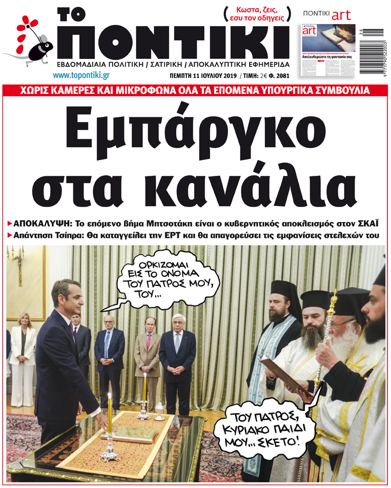 Με πρωτοσέλιδο τίτλο «Εμπάργκο στα κανάλια» και αναφερόμενο στην απόφαση της κυβέρνησης για τις συνεδριάσεις του υπουργικού συμβουλίου χωρίς κάμερες και μικρόφωνα, κυκλοφορεί το «ΠΟΝΤΙΚΙ» το πρωί της Πέμπτης.