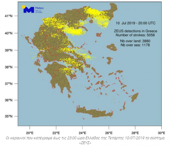 Σύμφωνα το σύστημα ανίχνευσης ηλεκτρικών εκκενώσεων του Εθνικού Αστεροσκοπείου Αθηνών/meteo.gr «ZEUS», έως τις 23:00 ώρα Ελλάδος κατέγραψε πάνω από 5.000 κεραυνούς εντός των ορίων της Ελληνικής επικράτειας.