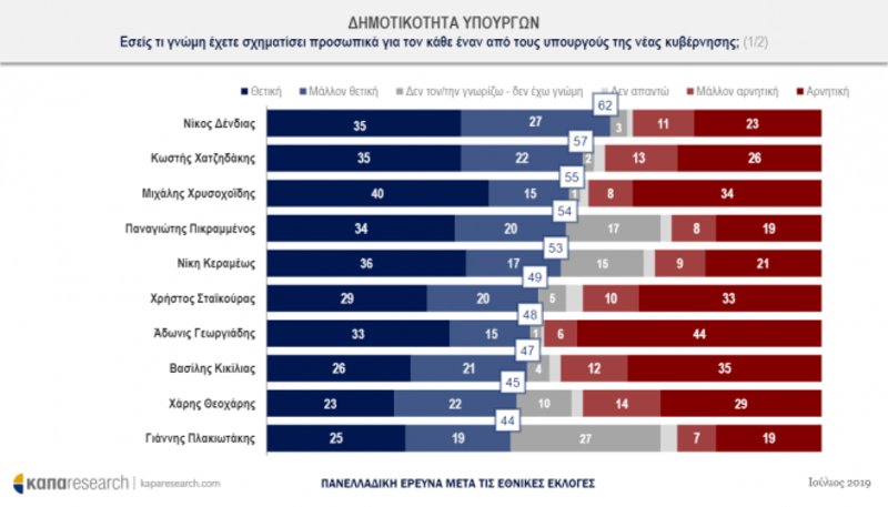 Σε σχέση με την αποδοχή των υπουργών της κυβέρνησης Μητσοτάκης, στην πρώτη θέση βρίσκεται ο υπουργός Εξωτερικών Νίκος Δένδιας με 62%, και ακολουθούν ο υπουργός Περιβάλλοντος Κωστής Χατζηδάκης με 57%, ο υπουργός Προστασίας του Πολίτη Μιχάλης Χρυσοχοϊδης 55%, ο αντιπρόεδρος της κυβέρνησης Παναγιώτης Πικραμμένος με 54 % και η υπουργός Παιδείας Νίκη Κεραμέως με 53%.