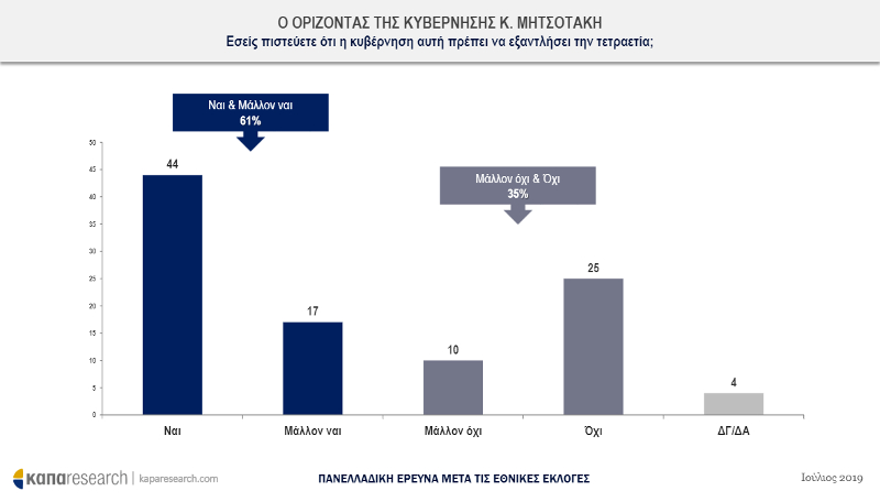 Στη συνέχεια, προσθέτει ότι τα αποτελέσματα του έργου της, η ευκρίνεια των παρεμβάσεών της, η ηθική των μελών της και η επιμονή της στα δύσκολα θα κρίνουν το χρονικό εύρος βιωσιμότητάς της. Η μεγάλη πλειοψηφία (άνω του 60%) την θέλει να εξαντλεί την τετραετία. Οι πολίτες αναμένουν κινήσεις – με αποφασιστικότητα – στους τομείς του φορολογικού, της ασφάλειας, των επενδύσεων, της Παιδείας και του εκσυγχρονισμού του κράτους.
