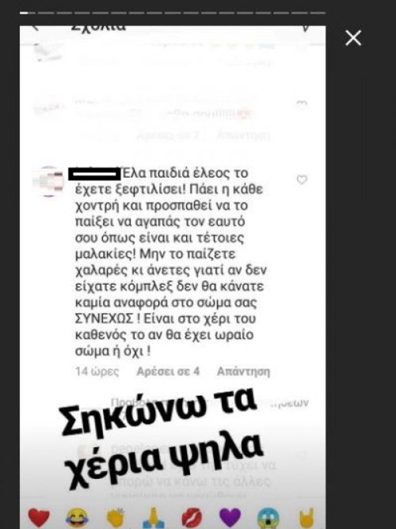 Η ανάρτησή της συγκέντρωσε δεκάδες θετικά σχόλια αλλά και ένα αρνητικό: «Έλα παιδιά έλεος το έχετε ξεφτιλίσει! Πάει η κάθε χοντρή και προσπαθεί να το παίξει να αγαπάς τον εαυτό σου και τέτοιες …. Μην το παίζετε χαλαρές και άνετες γιατί αν δεν είχατε κόμπλεξ δεν θα κάνατε καμία αναφορά στο σώμα σας συνεχώς. Είναι στο χέρι του καθενός το αν θα έχει ωραίο σώμα ή όχι» follower που την έκανε έξαλλη.