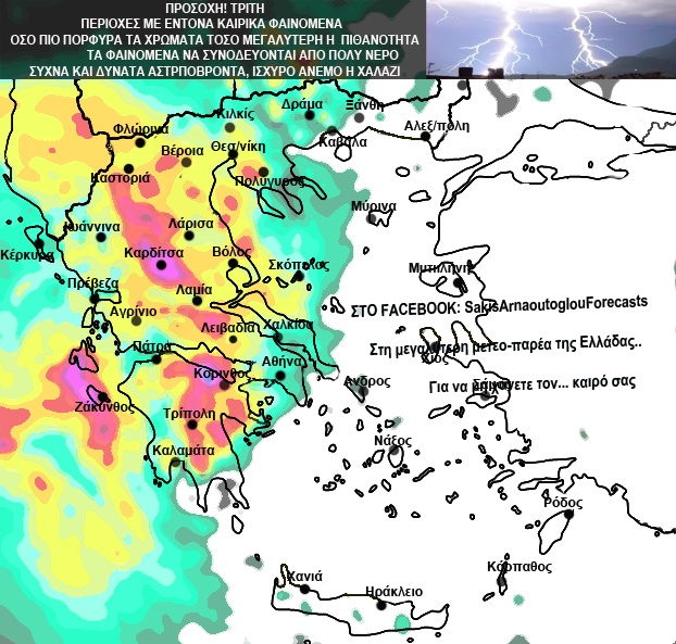 Συγκεκριμένα, μέσω της σελίδας του στο Facebook, ο Σ. Αρναούτογλου προειδοποίησε για νέα ισχυρή κακοκαιρία την Τρίτη, υπογράμμίζοντας: «Tα πρώτα στοιχεια για την επιδείνωση του καιρού της Τρίτης! Κάντε κλικ πάνω στο χάρτη και διαβάστε σας παρακαλώ την επεξήγηση στον τίτλο! Σύμφωνα και με τα τελευταία προγνωστικά στοιχεί δείχνει να επηρεάζεται κυριώς η δυτική και η ηπειρωτική Ελλάδα με βροχές αλλά και καταιγίδες που ίσως δώσουν “πολύ νερό” αυξάνοντας τον κίνδυνο τοπικών αιφνίδιων πλημμυρών!».