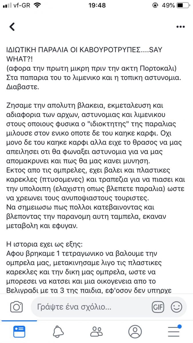 Ο λουόμενος εξιστορεί στην μακροσκελή ανάρτηση του, τα όσα έζησε μαζί με την παρέα του πριν από μερικές μέρες, όταν επισκέφτηκαν την παραλία Καβουρότρυπες, μία από τις πιο όμορφες της περιοχής.