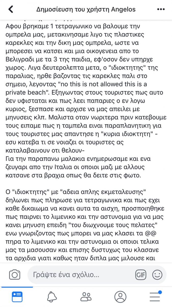 Σύμφωνα με ρεπορτάζ του protothema.gr, που επικαλείται ανάρτηση λουόμενου στο facebook, ο επιχειρηματίας φέρεται να έχει καταπατήσει με ομπρελοκαθίσματα ολόκληρη την παραλία.