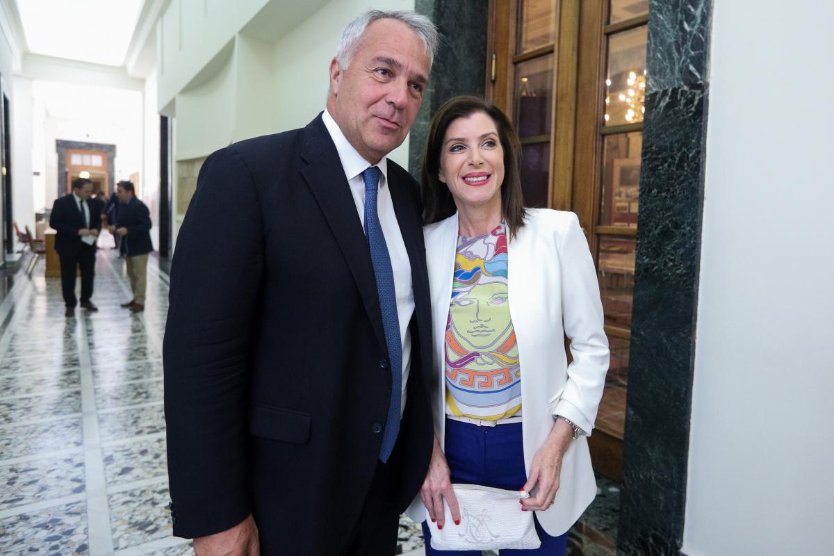 H Νόνη Δούνια με φλοράλ φόρεμα σε θερμή χειραψία με τον Κώστα Καραμανλή