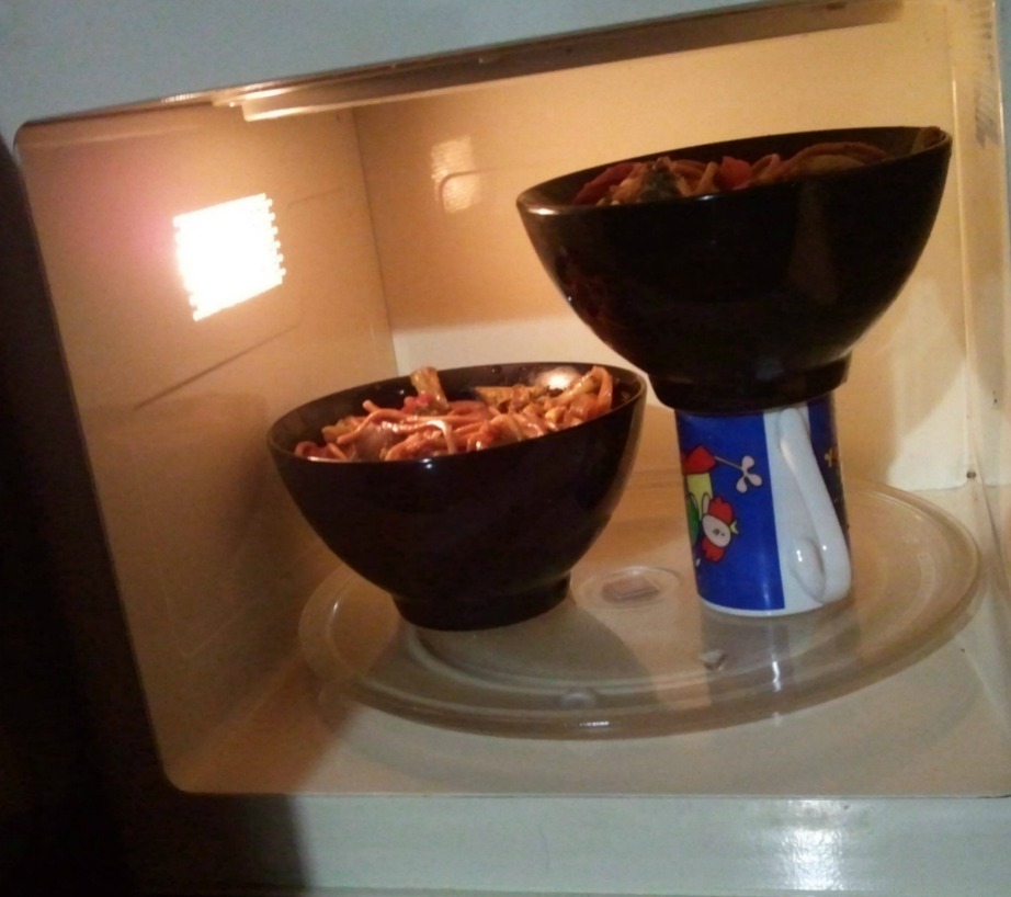Βάλτε το ένα πιάτο στον φούρνο σας και τοποθετήστε το στην μια άκρη. Βάλτε δίπλα μια κούπα και πάνω στην κούπα τοποθετήστε το δεύτερο πιάτο ή μπολ. Έτσι θα δημιουργηθούν δύο επίπεδα μέσα στον φούρνο μικροκυμάτων σας και θα μπορέσετε να ζεστάνετε δύο πιάτα σε λιγότερο χρόνο. Με αυτόν τον τρόπο ο φούρνος μικροκυμάτων θα γίνει ακόμα πιο χρήσιμος στην κουζίνα σας. Επιπλέον, δεν θα προλαβαίνει να κρυώσει το ένα πιάτο μέχρι να ζεσταθεί το επόμενο αφού θα τοποθετούνται ανά δύο στον φούρνο σας. Βάζοντας δύο δύο τα πιάτα στον φούρνο ο χρόνος αναμονής μειώνεται και το φαγητό τρώγεται από όλους ζεστό.