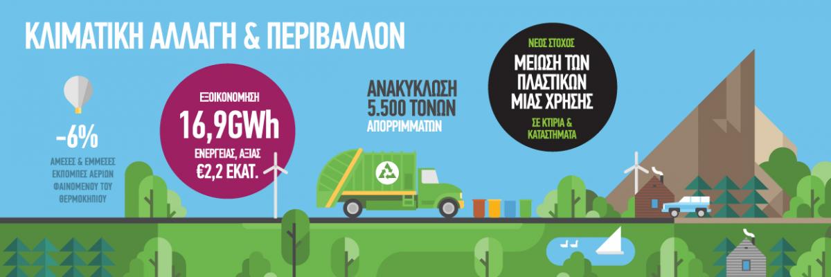 Το 2018, ο Όμιλος ΟΤΕ συνέχισε τη μείωση (κατά 6%) των άμεσων και έμμεσων εκπομπών αερίων θερμοκηπίου (ΑΦΘ), ενώ εξοικονόμησε 16,9 GWh ενέργειας, αξίας 2,2 εκατ. ευρώ. Παράλληλα, προώθησε προς ανακύκλωση 5.500 τόνους απορριμμάτων, ενώ μέσα από το εκτεταμένο εσωτερικό πρόγραμμα ανακύκλωσης που υλοποιεί -με διαχωρισμό στην πηγή- την περασμένη χρονιά ανακυκλώθηκαν πάνω από 94 τόνοι απορριμμάτων.