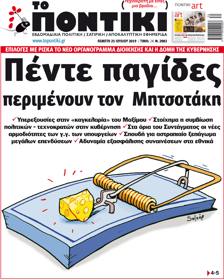 Με πρωτοσέλιδο τίτλο «Πέντε παγίδες περιμένουν τον Μητσοτάκη» και αναλυτικό-αποκαλυπτικό ρεπορτάζ για τις επιλογές ρίσκου με το νέο οργανόγραμμα διοίκησης και τη δομή της κυβέρνησης, κυκλοφορεί το «ΠΟΝΤΙΚΙ» το πρωί της Πέμπτης.