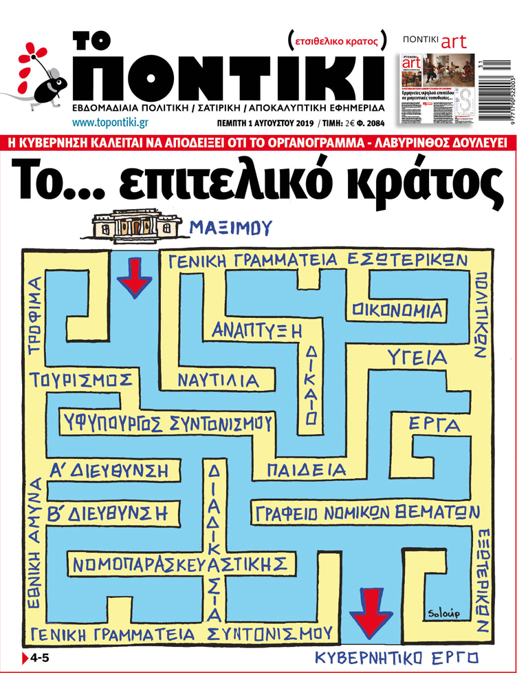 Με πρωτοσέλιδο τίτλο «Το… επιτελικό κράτος» και αναλυτικό-αποκαλυπτικό ρεπορτάζ για την κυβέρνηση που καλείται να αποδείξει ότι το οργανόγραμμα-λαβύρινθος δουλεύει, κυκλοφορεί το «ΠΟΝΤΙΚΙ» το πρωί της Πέμπτης.