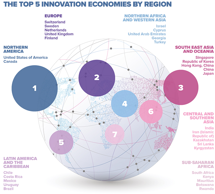 Η Ελβετία, που παραμένει για εννέα χρόνια στην κορυφή του κόσμου, έχει εξαιρετικά αποτελέσματα καινοτομίας, συμπεριλαμβανομένων των αιτήσεων για διπλώματα ευρεσιτεχνίας και των εξαγωγών προϊόντων υψηλής τεχνολογίας. Η Σουηδία κατατάσσεται δεύτερη σε παγκόσμιο επίπεδο χάρη στην αναπτυγμένη υποδομή της, στον καινοτόμο επιχειρηματικό τομέα και στις εξαγωγές γνώσης και της τεχνολογίας.
