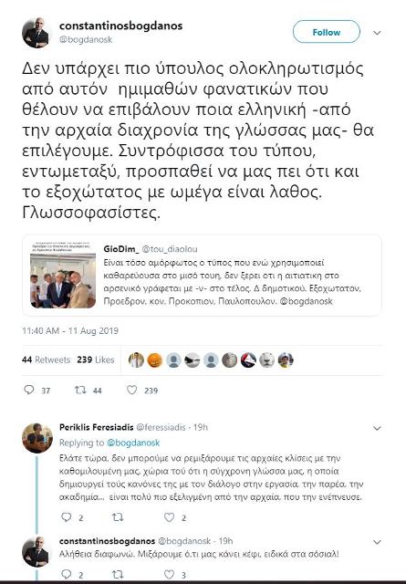 Τότε άρχισε το ρεσιτάλ Μπογδάνου (στις αναδημοσιεύσεις των αναρτήσεών του διατηρήσαμε την ορθογραφία του): «ούτε να διανοηθείτε ότι θα μου επιβάλετε και ποια ορθογραφία θα ακολουθώ. Η γλώσσα είναι δικαίωμα και ο ολοκληρωτισμός σας ούτε εδώ περνάει», έγραψε για να προσθέσει: «Δεν υπάρχει πιο ύπουλος ολοκληρωτισμός από αυτόν ημιμαθών φανατικών που θέλουν να επιβάλουν ποια ελληνική -από την αρχαία διαχρονία της γλώσσας μας- θα επιλέγουμε. Συντρόφισσα του τύπου, εντωμεταξύ, προσπαθεί να μας πει ότι και το εξοχώτατος με ωμέγα είναι λαθος. Γλωσσοφασίστες».