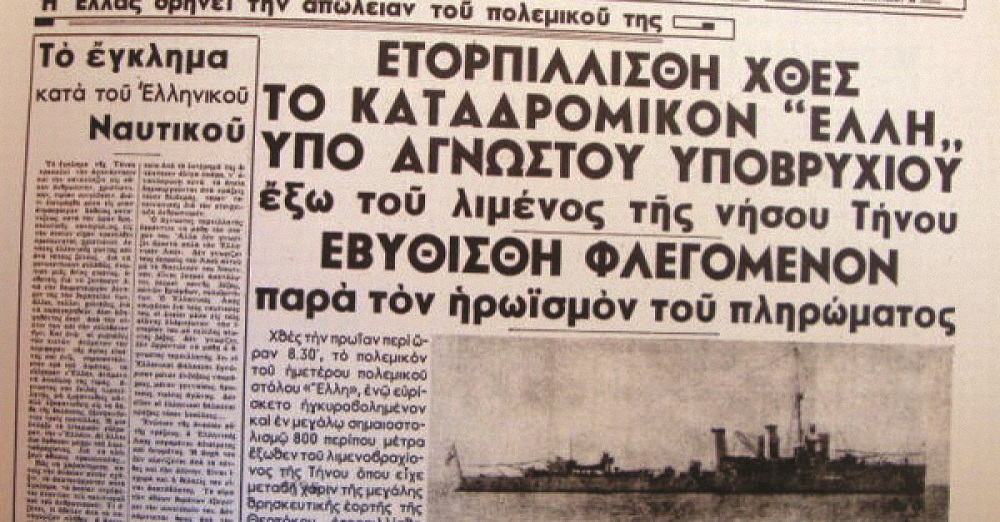 «Στις 15 Αυγούστου του 1940 και περί ώρα 08:25΄ λίγο πριν από τη λιτάνευση της ιερής εικόνας στην Τήνο, και ενώ στην προκυμαία υπήρχε ήδη πολύς κόσμος, υποβρύχιο “εν καταδύσει” πλησίασε τον θαλάσσιο χώρο εξαπολύοντας τρεις τορπίλες κατά του ευδρόμου ΕΛΛΗ, εκ των οποίων μόνο μία έπληξε αυτό, προκαλώντας έκρηξη στο μηχανοστάσιο και πυρπόληση των δεξαμενών πετρελαίου, με 9 νεκρούς και 24 τραυματίες. Οι δε άλλες δύο τορπίλες αστόχησαν και εξερράγησαν στην προκυμαία χωρίς ευτυχώς να προκαλέσουν θύματα. Παρά τις προσπάθειες, όμως, που κατέβαλε, με τη βοήθεια των επιβατικών πλοίων, το πλήρωμα να το ρυμουλκήσει στα ρηχά, τελικά το ΕΛΛΗ βυθίστηκε περίπου μία ώρα μετά, στις 09:45΄, και το πλήρωμα αναγκάστηκε να το εγκαταλείψει πηδώντας στη θάλασσα. Για καλή τύχη των τραυματισμένων ναυαγών, στην περιοχή βρίσκονταν τα αλιευτικά σκάφη ΠΡΟΠΟΝΤΙΣ και ΕΛΕΝΗ, ιδιοκτησίας Μιχάλη Σπυρ. Πετυχάκη. Αψηφώντας τον κίνδυνο της αναμενόμενης εκρήξεως της Έλλης, ο καπετάν Μιχάλης Πετυχάκης έδωσε σήμα στα σκάφη του να προσεγγίσουν και να περισυλλέξουν 24 τραυματίες ναυαγούς προτού υπάρξουν περισσότερα θύματα. Για την ηρωική του πράξη τιμήθηκε μαζί με το πλήρωμά του από τον βασιλέα Γεώργιο και την ελληνική κυβέρνηση με Τιμητική Ευαρέσκεια.