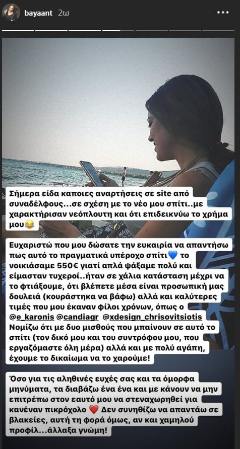 «Σήμερα είδα κάποιες αναρτήσεις σε site από συναδέλφους σε σχέση με το νέο μου σπίτι. Με χαρακτήρισαν νεόπλουτη και ότι επιδεικνύω το χρήμα μου. Ευχαριστώ που δώσατε την ευκαιρία να απαντήσω πως αυτό το πραγματικά υπέροχο σπίτι το νοικιάσαμε 550 ευρώ γιατί απλά ψάξαμε πολύ και ήμασταν τυχεροί.