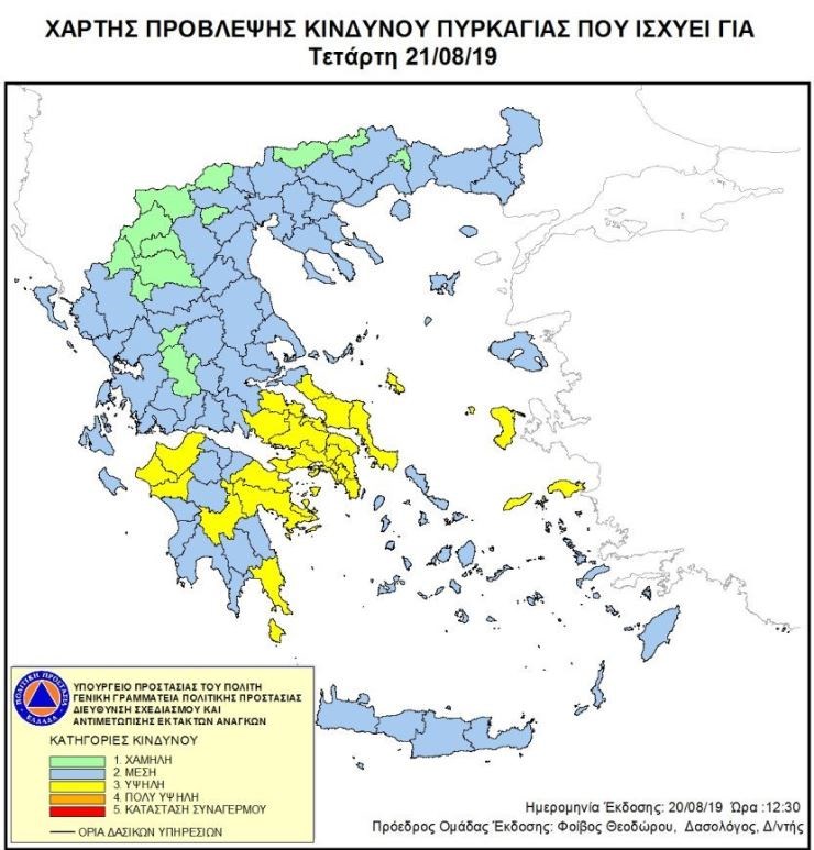 Υψηλός κίνδυνος εκδήλωσης πυρκαγιάς προβλέπεται για σήμερα, Τετάρτη, σύμφωνα με τον Χάρτη Πρόβλεψης Κινδύνου Πυρκαγιάς που εκδίδει η Γενική Γραμματεία Πολιτικής Προστασίας του Υπουργείου Προστασίας του Πολίτη.