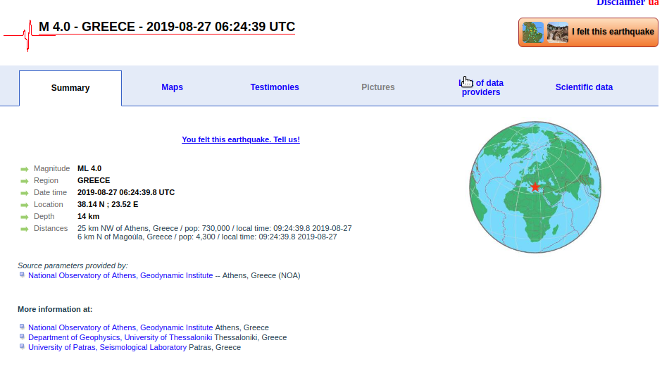 Το επίκεντρό του εντοπίζεται στην περιοχή της Μαγούλας Αττικής και συγκεκριμένα 25 χλμ. βόρειοδυτικά της Αθήνας.