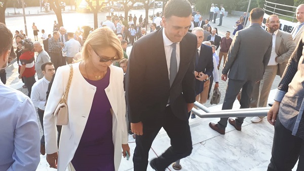 Οι δυο τους εμφανίστηκαν στα σκαλιά του συνεδριακού κέντρου «Ι. Βελλίδης» προσερχόμενοι στην ομιλία του Πρωθυπουργού Κυριάκου Μητσοτάκη.