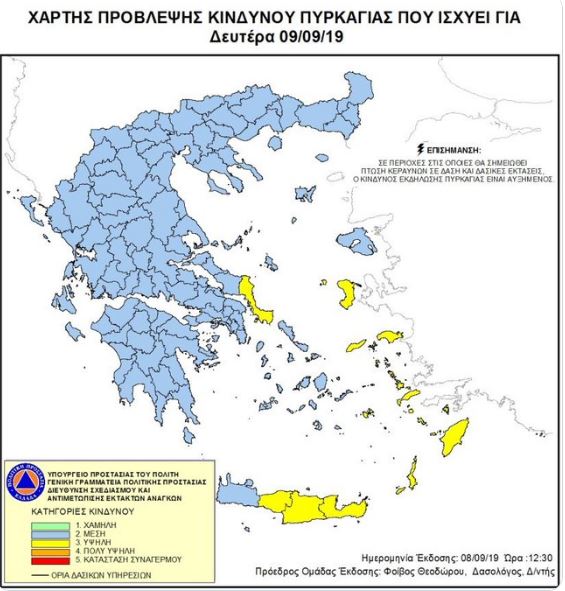 Υψηλός κίνδυνος πυρκαγιάς υπάρχει για αύριο, Δευτέρα 9 Σεπτεμβρίου 2019, σύμφωνα με τον Χάρτη Πρόβλεψης Κινδύνου Πυρκαγιάς, που εξέδωσε η Γενική Γραμματεία Πολιτικής Προστασίας.