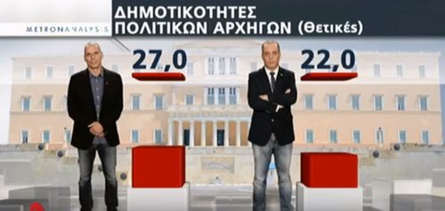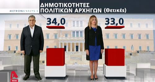 Στη συνέχεια, ο Δημήτρης Κουτσούμπας συγκέντρωσε το 34%, η Φώφη Γεννηματά 33%, ο Γιάνης Βαρουφάκης 27% και ο Κυριάκος Βελόπουλος 22%.
