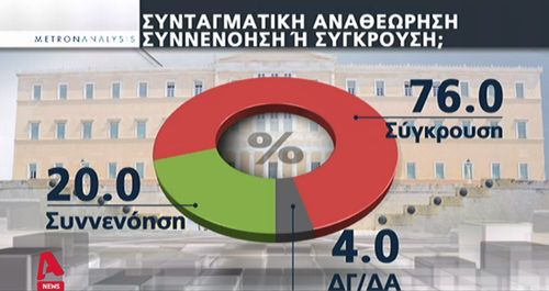 Σημειώνεται ότι το 76% θεωρεί πως θα υπάρξει σύγκρουση κατά τη διαδικασία της συνταγματικής αναθεώρησης, ενώ το 20% θεωρεί πως τα κόμματα θα συνεννοηθούν.