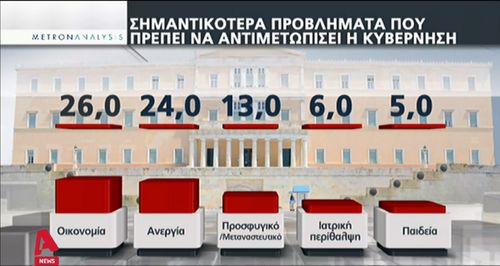 Οι πολίτες εκτιμούν ότι ένα από τα σημαντικότερα προβλήματα με τα οποία βρίσκεται αντιμέτωπη η κυβέρνηση είναι η οικονομία, σύμφωνα με νέα δημοσκόπηση της Metron Analysis για λογαριασμό του κεντρικού δελτίου ειδήσεων του Alpha.