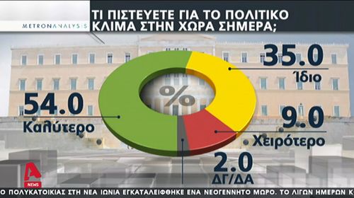 Το 54% απαντά πως το πολιτικό κλίμα είναι καλύτερο μετά τις εκλογές, ενώ το 35% απαντά πως δεν υπάρχει διαφορά. Το 9% εκτιμά πως το πολιτικό κλίμα έχει οξυνθεί.