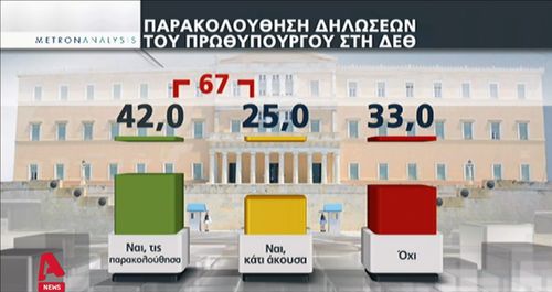 Το 67% απαντά πως παρακολούθησε ή άκουσε κομμάτι των δηλώσεων του πρωθυπουργού στη ΔΕΘ, ενώ το 33% απάντησε πως δεν είδε τις τοποθετήσεις του κ. Μητσοτάκη.