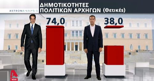 Στη δημοτικότητα των πολιτικών αρχηγός, πρώτος εμφανίζεται ο Κυριάκος Μητσοτάκης, ο οποίος συγκεντρώνει το 74% και δεύτερος ακολουθεί ο πρόεδρος του ΣΥΡΙΖΑ Αλέξης Τσίπρας με 38%.