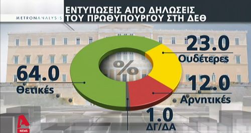 Το 64% κρίνει θετικά τις εξαγγελίες του πρωθυπουργού στη Διεθνή Έκθεση Θεσσαλονίκης, ενώ το 12% αρνητικά. Ουδέτερα τις κρίνει το 24%.