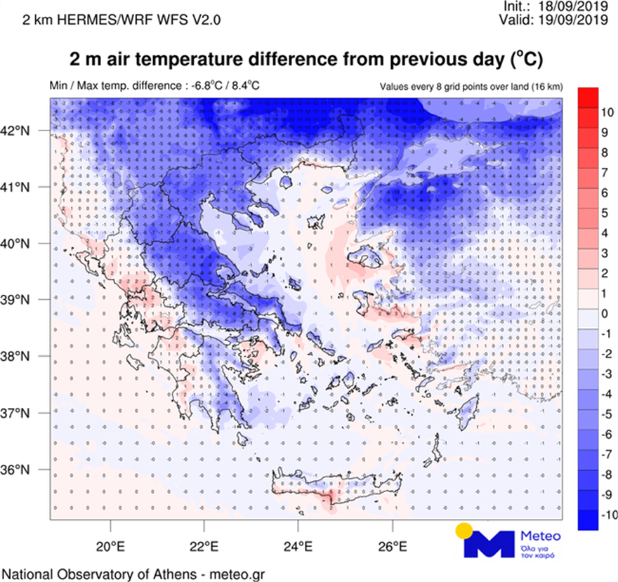 Οι άνεμοι θα πνέουν στα ανατολικά και βόρεια, βορειοανατολικοί 4 με 6 μποφόρ και στα δυτικά και νότια από δυτικές διευθύνσεις 3 με 5 μποφόρ, ενώ η θερμοκρασία θα σημειώσει πτώση κυρίως στα βόρεια.