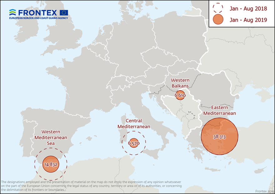 Σε επίπεδο οχταμήνου η αύξηση, σύμφωνα με τη Frontex, για τις αφίξεις μεταναστών και προσφύγων στην ανατολική Μεσόγειο ήταν της τάξης του 10% σε σχέση με το αντίστοιχο διάστημα του 2018 – με τον συνολικό αριθμό να ανέρχεται σε 38.300 άτομα.