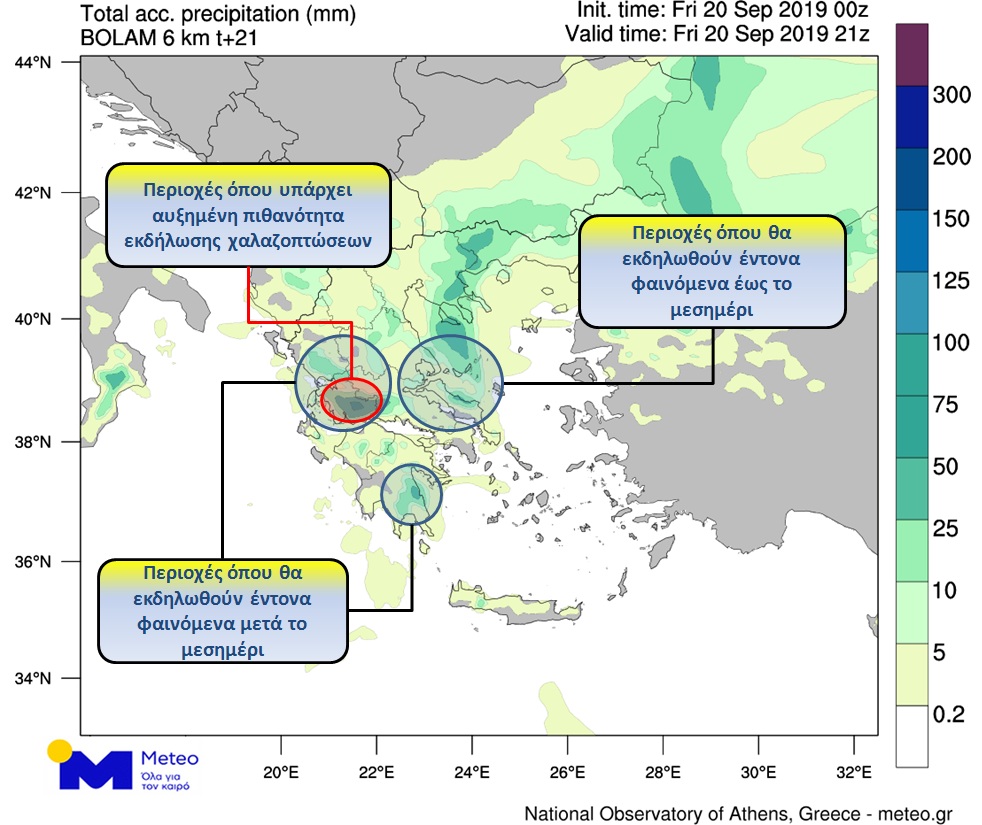 Στο χάρτη που ακολουθεί παρουσιάζονται τα εκτιμώμενα αθροιστικά ύψη βροχής κατά τη διάρκεια της Παρασκευής 20/09/2019. Με κύκλους σημειώνονται οι περιοχές όπου αναμένονται έντονα φαινόμενα και χαλαζοπτώσεις.