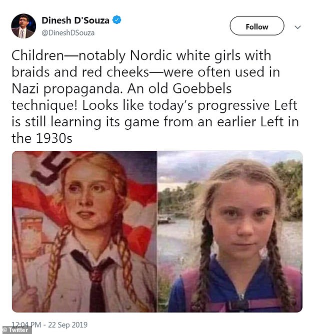 Λέει επίσης πως η 16χρονη Σουηδή ακτιβίστρια Γκρέτα Τούμπεργκ που πήγε στις ΗΠΑ χρησιμοποιεί προπαγάνδα όμοια με εκείνη των ναζί, όπου εμφανίζεται ένα ξανθό κορίτσι με πλεξούδες στα μαλλιά.