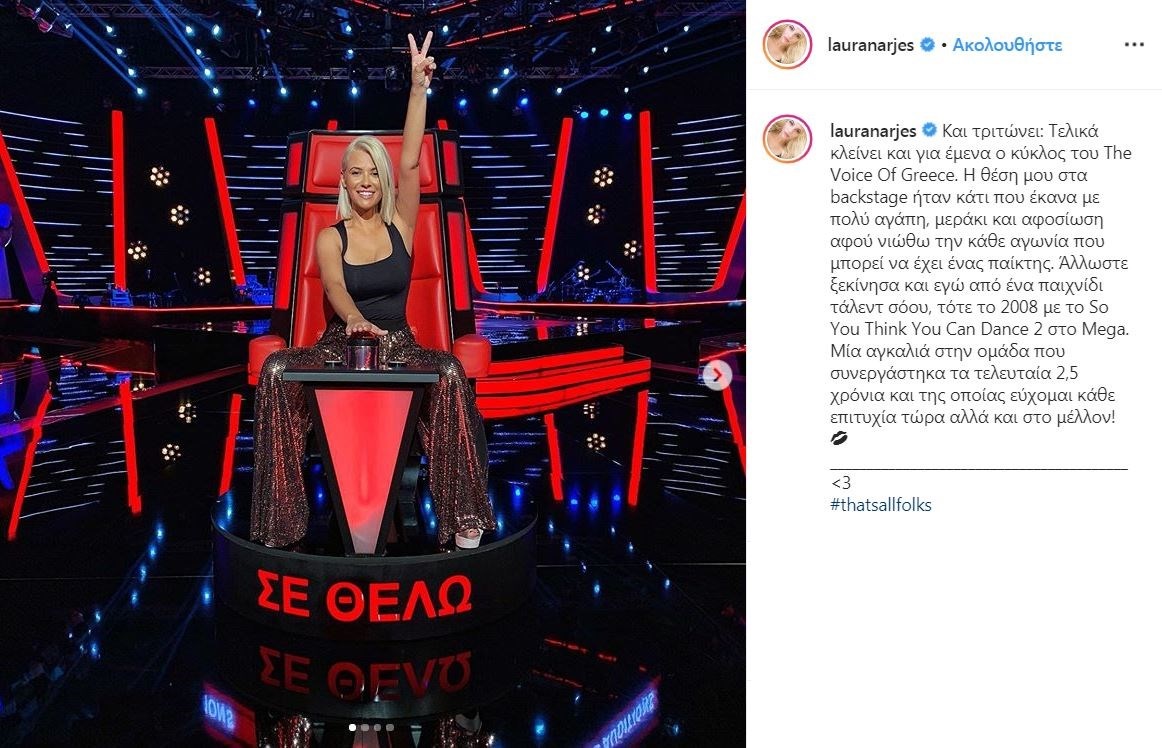 «Και τριτώνει: Τελικά κλείνει και για έμενα ο κύκλος του The Voice Of Greece. Η θέση μου στα backstage ήταν κάτι που έκανα με πολύ αγάπη, μεράκι και αφοσίωση αφού νιώθω την κάθε αγωνία που μπορεί να έχει ένας παίκτης», έγραψε μεταξύ άλλων η Λάουρα Νάργες.