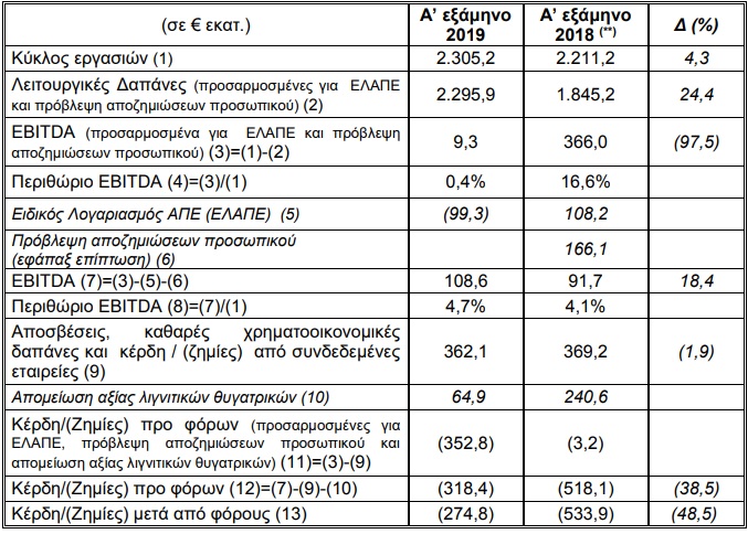 Ειδικότερα, τα κέρδη προ τόκων, φόρων και αποσβέσεων (EBITDA) του α΄ εξαμήνου του 2019 για το σύνολο του Ομίλου ενισχύθηκαν από την επιστροφή 99,3 εκατ. έναντι του πλεονάσματος του Ειδικού Λογαριασμού ΑΠΕ (ΕΛΑΠΕ). Χωρίς την επιστροφή αυτή το EBITDA διαμορφώνεται σε 9,3 εκατ. Αντίστοιχα και για λόγους συγκρισιμότητας με το α’ εξάμηνο 2018, το EBITDA της αντίστοιχης περυσινής περιόδου προσαρμόζεται με την χρέωση ύψους 108,2 εκατ. για την κάλυψη του ελλείμματος του ΕΛΑΠΕ (η οποία καταργήθηκε από 1.1.2019) και με την πρόβλεψη αποζημιώσεων προσωπικού 166,1 εκατ. και διαμορφώνεται σε 366 εκατ.
