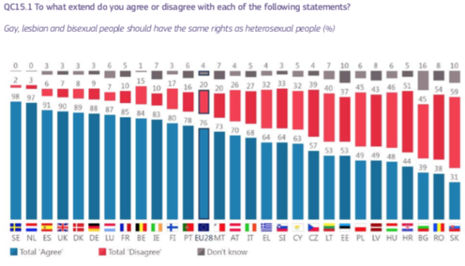 Οι Έλληνες στηρίζουν τα δικαιώματα των ΛΟΑΤ ατόμων μόνο στα λόγια. Αυτό προκύπτει από την σχετική έρευνα του Ευρωβαρόμετρου όπου ενώ οι περισσότεροι Έλληνες απαντούν σε ποσοστό 68% ότι θα πρέπει οι ΛΟΑΤ να έχουν τα ίδια δικαιώματα με τους ετερόφυλους όταν οι ερωτήσεις γίνονται πιο συγκεκριμένες τα ποσοστά γίνονται ιδιαίτερα αρνητικά με την χώρα μας (μαζί με την Κύπρο) να έχουν τα χαμηλότερα ποσοστά ανάμεσα στις χώρες της Δυτικής Ευρώπης πίσω και από αρκετές χώρες του πρώην Ανατολικού μπλοκ.