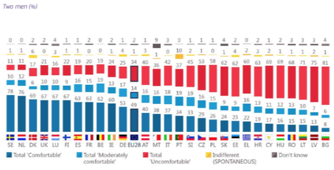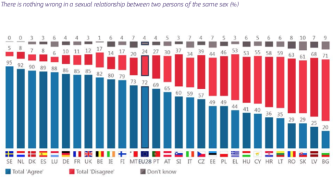 Στην έρευνα που πραγματοποιήθηκε τον περασμένο Μάιο, αλλά δημοσιοποιήθηκε την 1η Οκτωβρίου, οι Έλληνες συμφωνούν με ποσοστό μόλις 44% (σ.σ. ο μέσος όρος στην Ευρώπη είναι στο 72%) στην τοποθέτηση ότι δεν υπάρχει κάτι λάθος στην σεξουαλική σχέση μεταξύ δύο ατόμων του ίδιου φύλου.